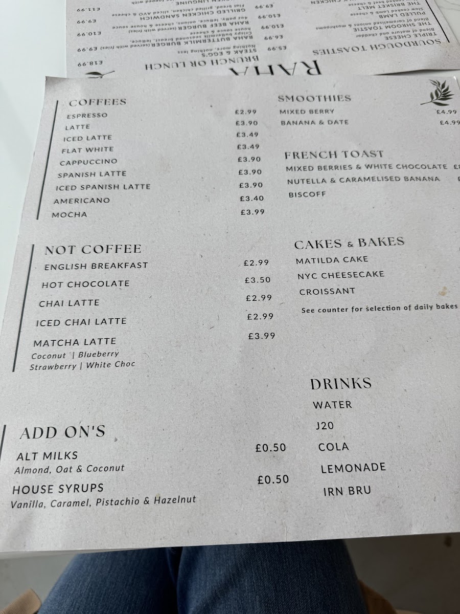 At Café RAHA, the menu is thoughtfully curated, showcasing an enticing selection of smoothies, teas, and delectable cakes that promise to satisfy your cravings. Start your day with a refreshing Mango or Mixed Berry Smoothie, each priced at just £4.99, bursting with vibrant flavors that can invigorate your morning. For tea lovers, the English Breakfast and Peppermint Tea (all £2.49) offer a comforting refuge during your visit, perfect for a cozy chat or simply unwinding after a busy day.